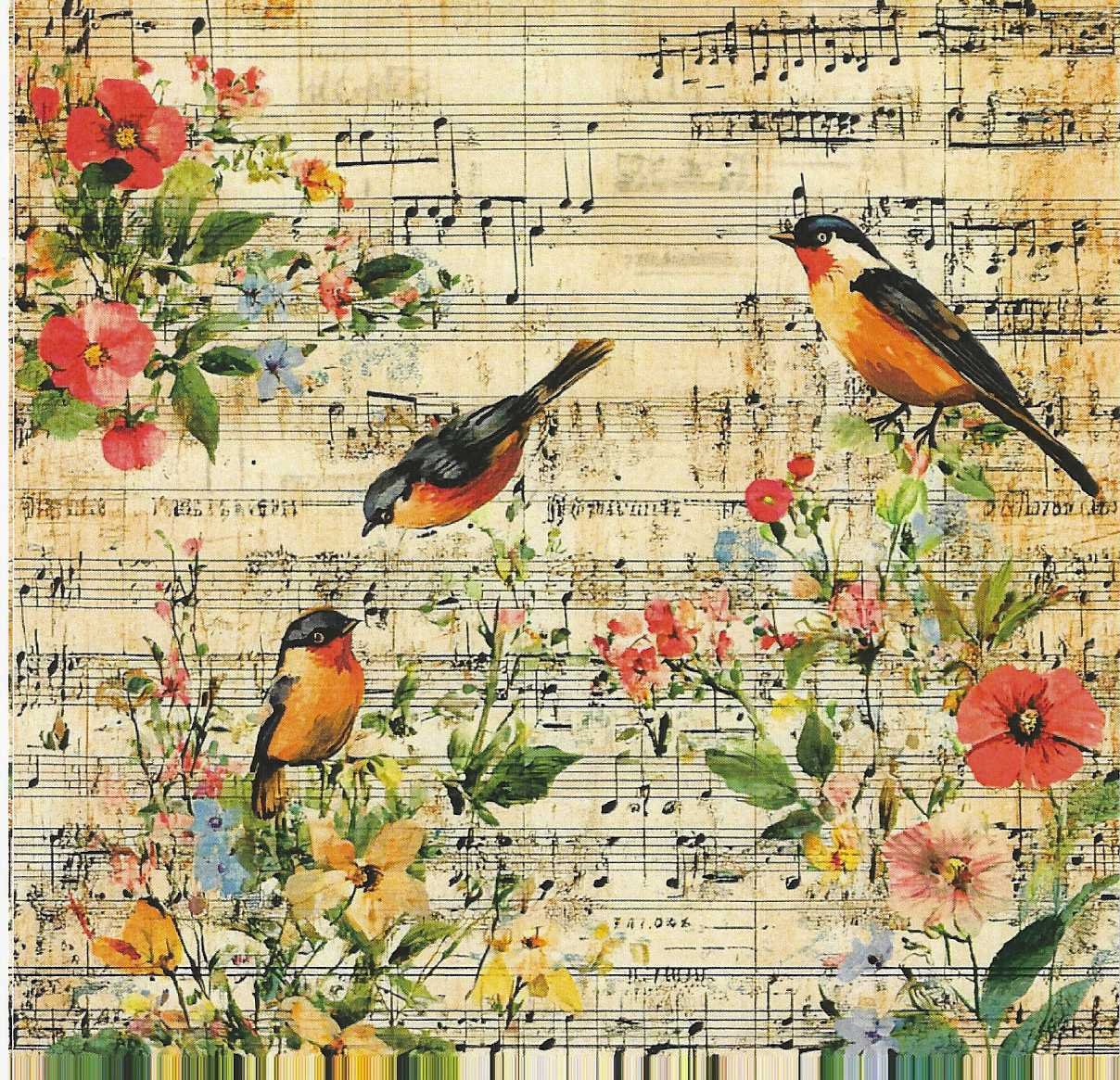 Cada diseño combina delicadas flores en tonos cálidos, aves detalladas y fondos envejecidos con notas musicales, creando una atmósfera romántica y artística que evoca tiempos pasados.