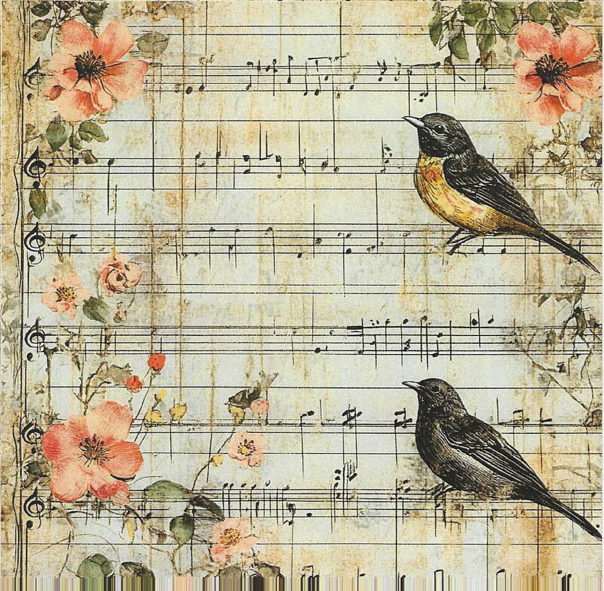 Estas 24 tarjetas decorativas presentan delicadas aves ilustradas sobre fondos de partituras musicales antiguas, acompañadas de flores en tonos suaves y efecto envejecido que aporta un estilo romántico y elegante.
