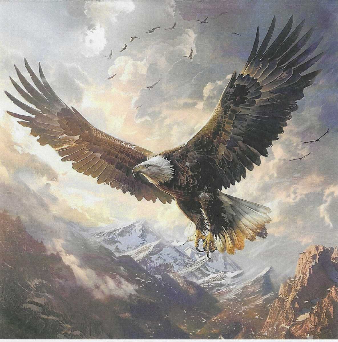 La combinación de tonos fríos, montañas imponentes y alas abiertas transmite fuerza y profundidad visual. Ideal para quienes aman la naturaleza, la fauna salvaje y las imágenes con carácter.