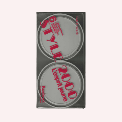Elegante juego de posavasos en condición nueva, de la marca Maastricht, fabricado en Holanda, con un diseño que refleja claramente el estilo moderno de fines de los años 90 y comienzos de los 2000.