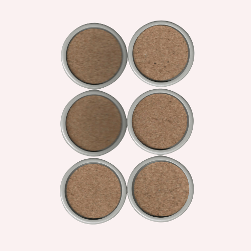 Los posavasos están realizados en corcho natural, material ideal para proteger superficies del calor y la humedad, y se presentan encastrados dentro de un marco de plástico gris claro, que aporta rigidez, durabilidad y una estética sobria y contemporánea.