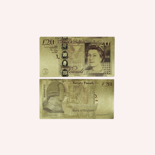 Este billete de fantasía dorado de £20, inspirado en el diseño de los billetes del Reino Unido, es una pieza puramente decorativa y coleccionable, creada como souvenir y objeto de exonumia. No es un billete de curso legal ni fue emitido por el Banco de Inglaterra ni por ninguna entidad financiera oficial.