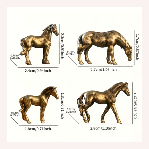 Una colección única que reúne cuatro hermosos caballos en miniatura color dorado metálico, cada uno con postura y carácter diferente.