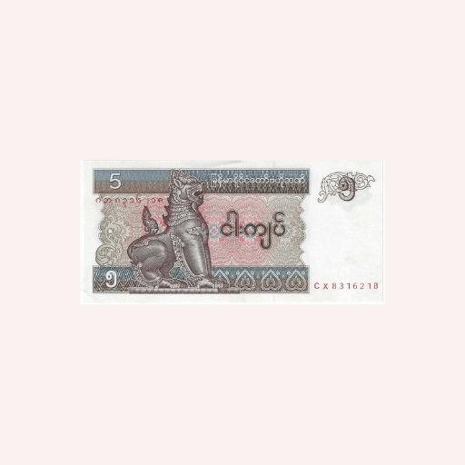No pierda esta oportunidad excepcional de adquirir un billete de 5 Kyats de Birmania/Myanmar de 1994, de calidad premium y sin circular. ¡Agregue hoy mismo profundidad histórica y belleza artística a su colección!