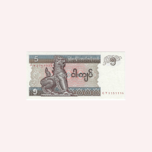No pierda esta oportunidad excepcional de adquirir un billete de 5 Kyats de Birmania/Myanmar de 1994, de calidad premium y sin circular. ¡Agregue hoy mismo profundidad histórica y belleza artística a su colección!