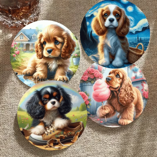 Hermoso posavasos decorativo elaborado sobre base de madera circular, ideal para quienes aman los perros y desean añadir un toque cálido y artístico a su hogar. Cada pieza presenta ilustraciones encantadoras de cachorros en escenas acogedoras y coloridas, creando un ambiente alegre y acogedor en cualquier espacio.