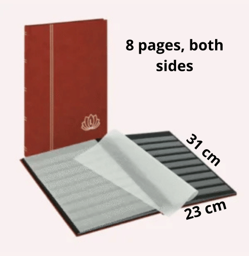 Sus dimensiones 230 × 305 mm lo hacen compatible con una amplia variedad de formatos de sellos, tanto individuales como en series, siendo ideal para coleccionistas principiantes y avanzados que buscan una solución práctica y profesional para organizar su material filatélico.