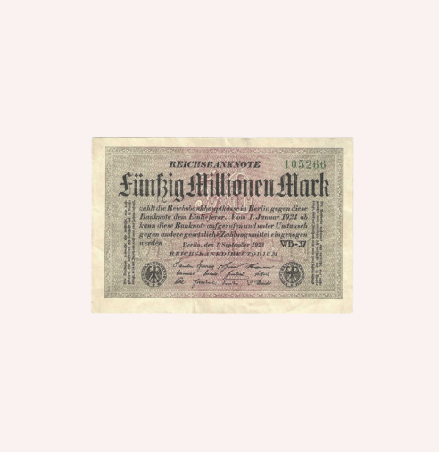 Este billete de 50,000,000 millones ofrece un diseño único que refleja el contexto de su época. La simbología, los colores y las inscripciones han sido cuidadosamente seleccionados para plasmar los valores y tensiones de 1924. Es un testimonio de la precisión y dedicación con que los bancos emitían moneda incluso en tiempos de crisis. Cada pieza es auténticamente antigua, garantizando su lugar como verdaderamente histórica.