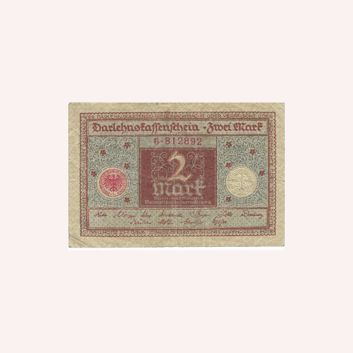 Estos billetes estuvieron en circulación hasta que la hiperinflación de 1923 sacudió la economía alemana, llevando a una depreciación masiva de la moneda. Este fenómeno económico no solo cambió el valor material de los billetes, sino también la percepción del dinero entre la población. A día de hoy, este billete de 2 marcos se ha convertido en un legado invaluable de esa época turbulenta, analizándose en estudios de economía histórica y siendo altamente apreciado por coleccionistas.