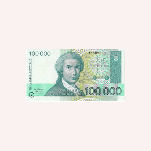 En el anverso, destaca el retrato de Ruđer Bošković, reconocido científico y pensador croata, representado con gran detalle y sobriedad. El diseño combina tonos verdes y elementos geométricos, junto con patrones de seguridad y numeración de serie visible. El valor facial “100.000” se presenta de forma clara y dominante, acorde a la alta denominación del billete.