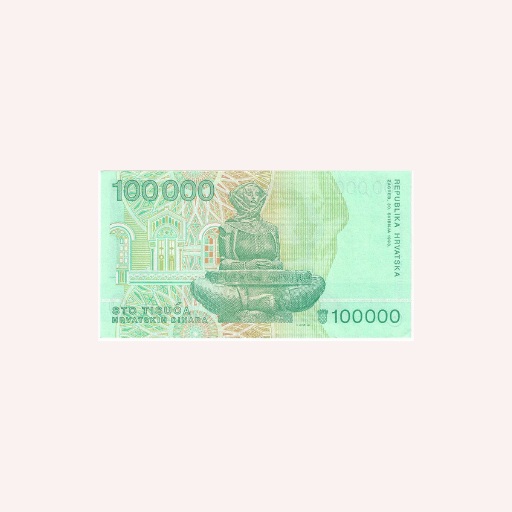 Este billete de 100.000 dinares de Croacia, emitido en 1993, es una pieza histórica de gran relevancia dentro del coleccionismo europeo. Corresponde al período inicial del sistema monetario croata tras la independencia del país, en una etapa marcada por profundos cambios políticos y económicos.