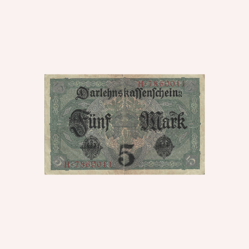 Este billete de 5 marcos es un reflejo de la estética y las técnicas gráficas propias de principios del siglo XX. Su diseño intrincado y meticuloso incluye inscripciones alemanas, detalles ornamentales y marcas de impresión únicas que lo convierten en una joya para coleccionistas y amantes de la numismática. Emitido entre 1914 y 1922, el Darlehnskassenschein está impregnado de las tensiones e historias que definieron Europa en ese entonces, siendo un testimonio del valor y la resistencia económica de la Alemania de esa época.