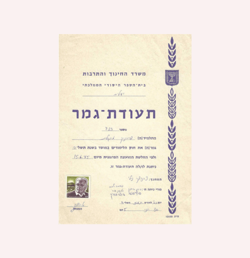 El año 1975 marca una etapa importante en la consolidación de Israel como nación, y este certificado es testigo de ese momento histórico. Emitido bajo el marco del sistema educativo y cultural de las IDF, el documento celebra la finalización de un curso diseñado para fomentar tanto el conocimiento como los valores fundamentales de la identidad nacional israelí. Este certificado refleja cómo las Fuerzas de Defensa no solo formaban soldados, sino también ciudadanos educados.