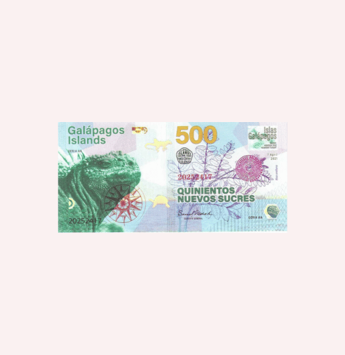 Este llamativo billete de fantasía “Islands Galápagos – Qunientos Nuevos Sucres (500) – 2021” es una pieza especialmente creada para el coleccionismo temático, inspirada en uno de los archipiélagos más emblemáticos y fascinantes del mundo: las Islas Galápagos.