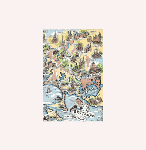 El diseño incluye un mapa detallado que resalta ciudades y puntos emblemáticos dentro de la región de Bretaña, con un enfoque especial en el departamento de Morbihan. Desde sus pintorescas aldeas hasta sus icónicas costas, el mapa no solo es visualmente atractivo, sino también informativo. Tanto si eres un ávido coleccionista como alguien que desea compartir un recuerdo inolvidable, esta postal realza tu conexión con la región al ofrecer una visión única de Morbihan.