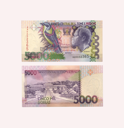 En la parte frontal del billete, se destaca la imponente imagen de Rei Amador, un líder histórico cuyos valores de libertad y resistencia resuenan hasta hoy en día. Junto a él, la representación de un ave llamada Papa Fido añade una capa de belleza natural y biodiversidad, simbolizando la espectacular fauna autóctona de S.Tomé e Príncipe. En la parte posterior, se encuentra un majestuoso edificio que representa la arquitectura emblemática de la región, completando un diseño visualmente armónico y culturalmente significativo.