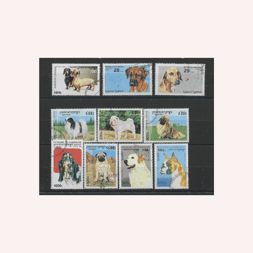 El lote incluye sellos con retratos de distintas razas caninas, representadas en escenas naturales, posturas expresivas y composiciones armoniosas. Cada país aporta su propio lenguaje visual, desde ilustraciones coloridas y modernas hasta diseños más clásicos y sobrios, creando un conjunto equilibrado, dinámico y muy agradable a la vista.