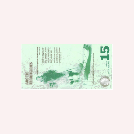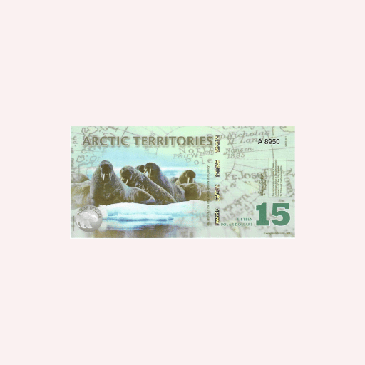 Billete de colección de 15 Dólares Árticos, elaborado en polímero, correspondiente a una emisión de fantasía del año 2011, inspirada en los Territorios Árticos y en la riqueza natural de las regiones polares. Esta pieza no es moneda de curso legal y no posee valor oficial de circulación, siendo creada exclusivamente con fines numismáticos, coleccionables y temáticos.
